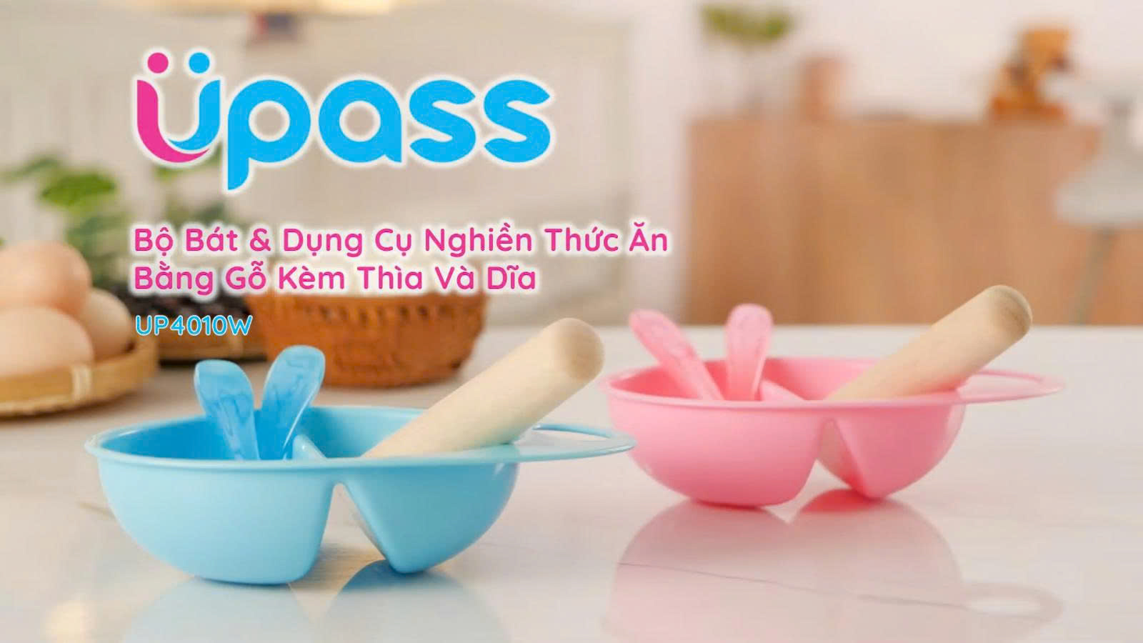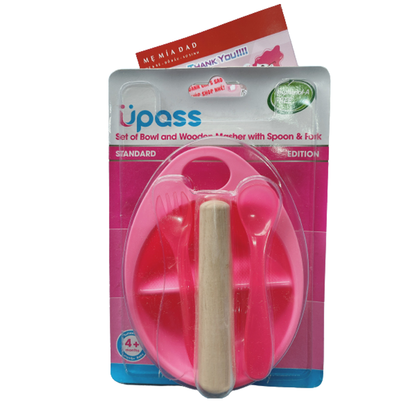Bộ bát và dụng cụ nghiền thức ăn bằng gỗ Upass (kèm thìa và dĩa) màu hồng