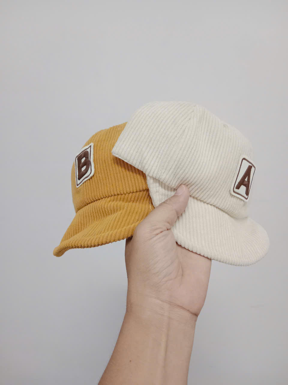 Nón kết sọc nhung chữ cái AB, gấu 3D size cho bé 2-5 tuổi Quảng Châu( còn vàng+trắng be)