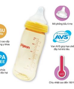 Với những đặc điểm nổi bật như: chất liệu bình PPSU an toàn tuyệt đối, thiết kế van thông khí chống sặc và đầy hơi ở trẻ, lưu lượng chảy phù hợp với trẻ sơ sinh, núm ty silicon khớp với sự chuyển động của lưỡi,… bình sữa Pigeon sẽ là sản phẩm hoàn hảo giúp chăm sóc sức khỏe bé tốt nhất, lại tiết kiệm chi phí tối đa nhờ tính bền đẹp theo thời gian sử dụng.
