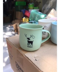 - Mặt ngoài của cốc nhám lì, hình chú hươu với dòng chữ HOKORI nổi bật.