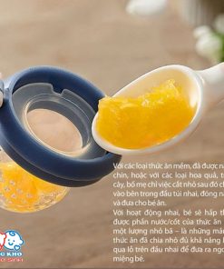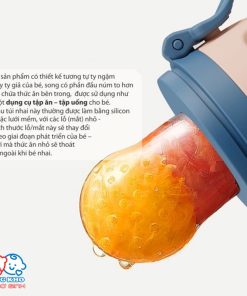 ► Chỉ cần cho thức ăn (hoa quả hoặc rau củ quả đã hấp mềm) vào trong túi nhai silicon an toàn và chắc chắn sau đó đóng lại rồi khóa chốt