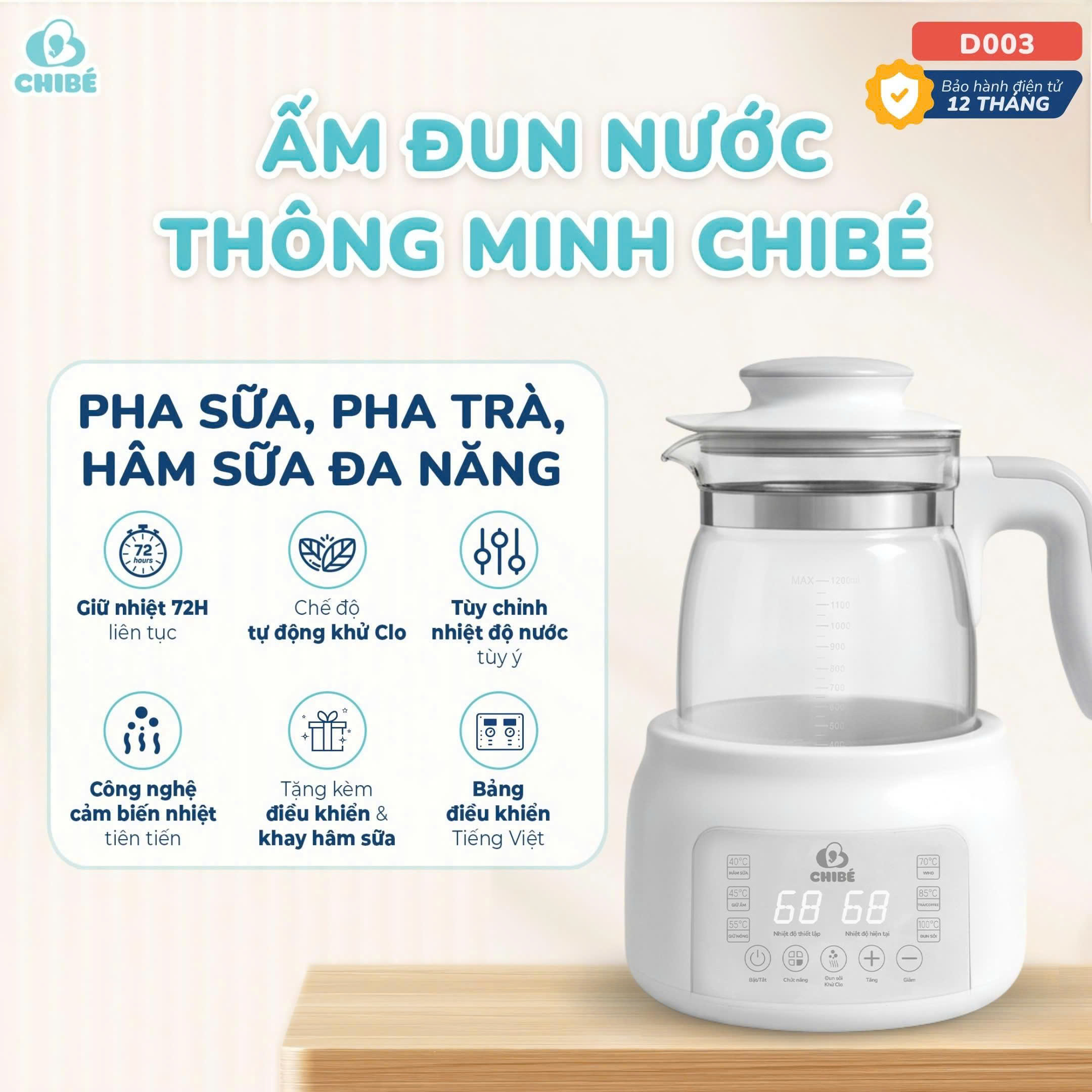VK-(Tặng 1 máy lắc pha sữa CB040)[BH 12 tháng]Ấm đun nước thông minh Chibe D003